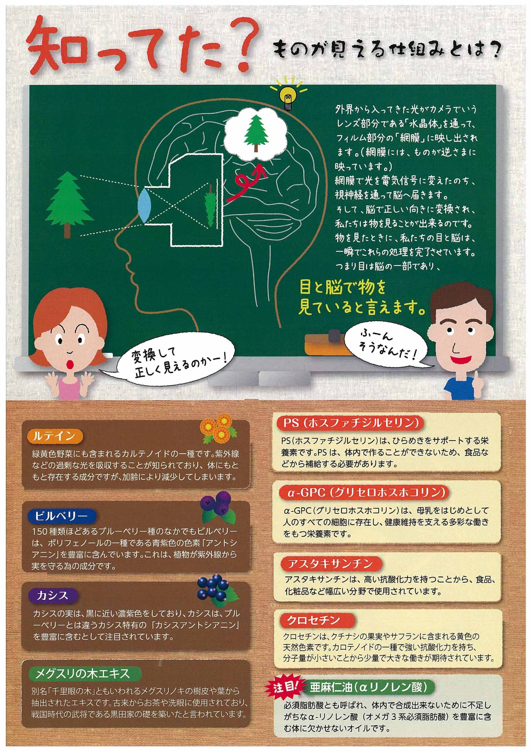 亜麻仁油(国内製造)、ビルベリー抽出物、ホスファチジルセリン含有リン脂質、カシス抽出物、DHA含有精製魚油、ビタミンE含有植物油、α-GPC(グリセロホスコリン)、メグスリノキ抽出物 / ゼラチン、グリセリン、マリーゴールド色素、レシチン、VB1、リンゴ酸、VB2、ヘマトコッカス藻色素、β-カロチン、ミツロウ、グリセリン脂肪酸エステル、クチナシ色素、シアノコバラミン、(一部に大豆・ゼラチンを含む)