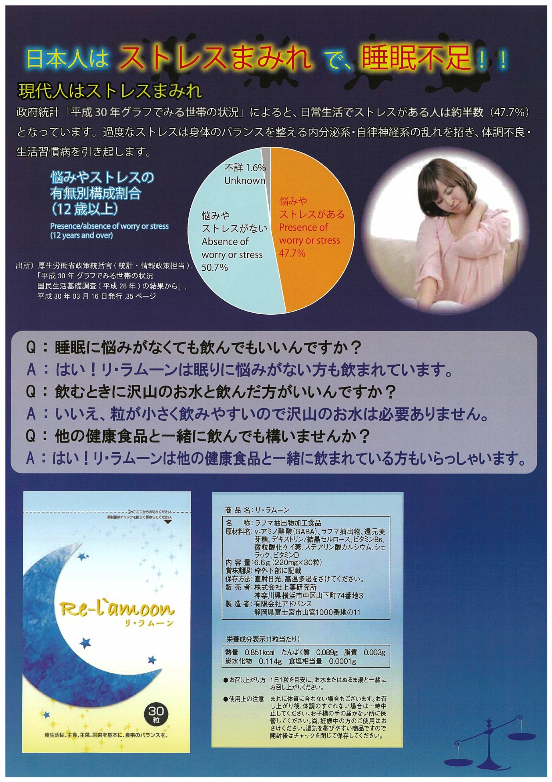 睡眠中は、レム睡眠(浅い睡眠)とノンレム睡眠(深い睡眠)が、約90分ごとに繰り返されていますが、 睡眠の質を高めて心身を回復させるには、体も脳も眠っているノンレム睡眠を増やすことが必要なのです。疲れているはずなのに眠れなかったり、すぐに目が覚めてしまうのは 心身に蓄積されたストレスのせいかもしれません。過度なストレスは身体のバランスを整える内分泌系・自律神経の乱れを招き、体調不良・生活習慣病を引き起こします。天然ハーブ・ラフマの葉に含まれる2つの成分は、ラフマ由来ヒペロシドと、ラフマ由来イソクエルシトリンです。